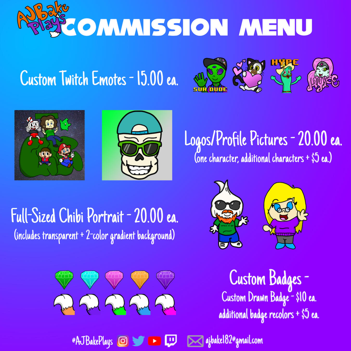 AJBake also offers a wide variety of commissioned art services, including custom Twitch emotes, logos, profile pictures, banners, overlays, and much more. Contact me via the outlets below, and let's create your next masterpiece!